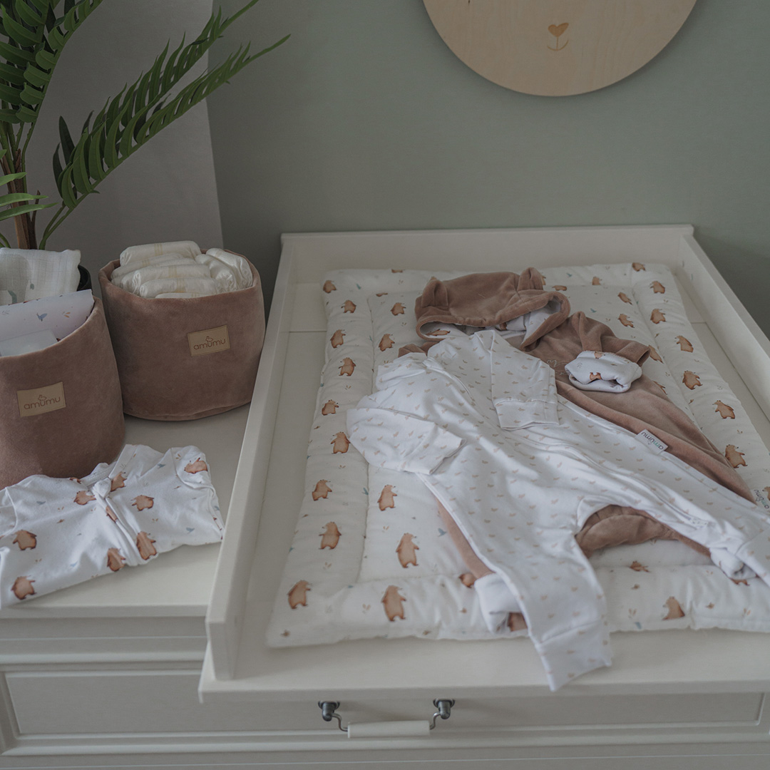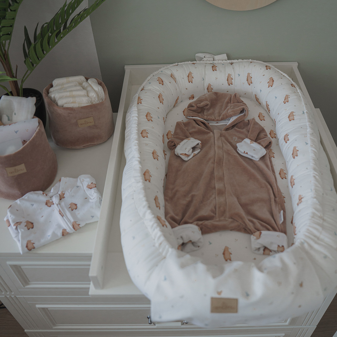 Miękki organizer na akcesoria niemowlęce Miś Henry, wykonany z bawełny premium oraz miłego w dotyku weluru.