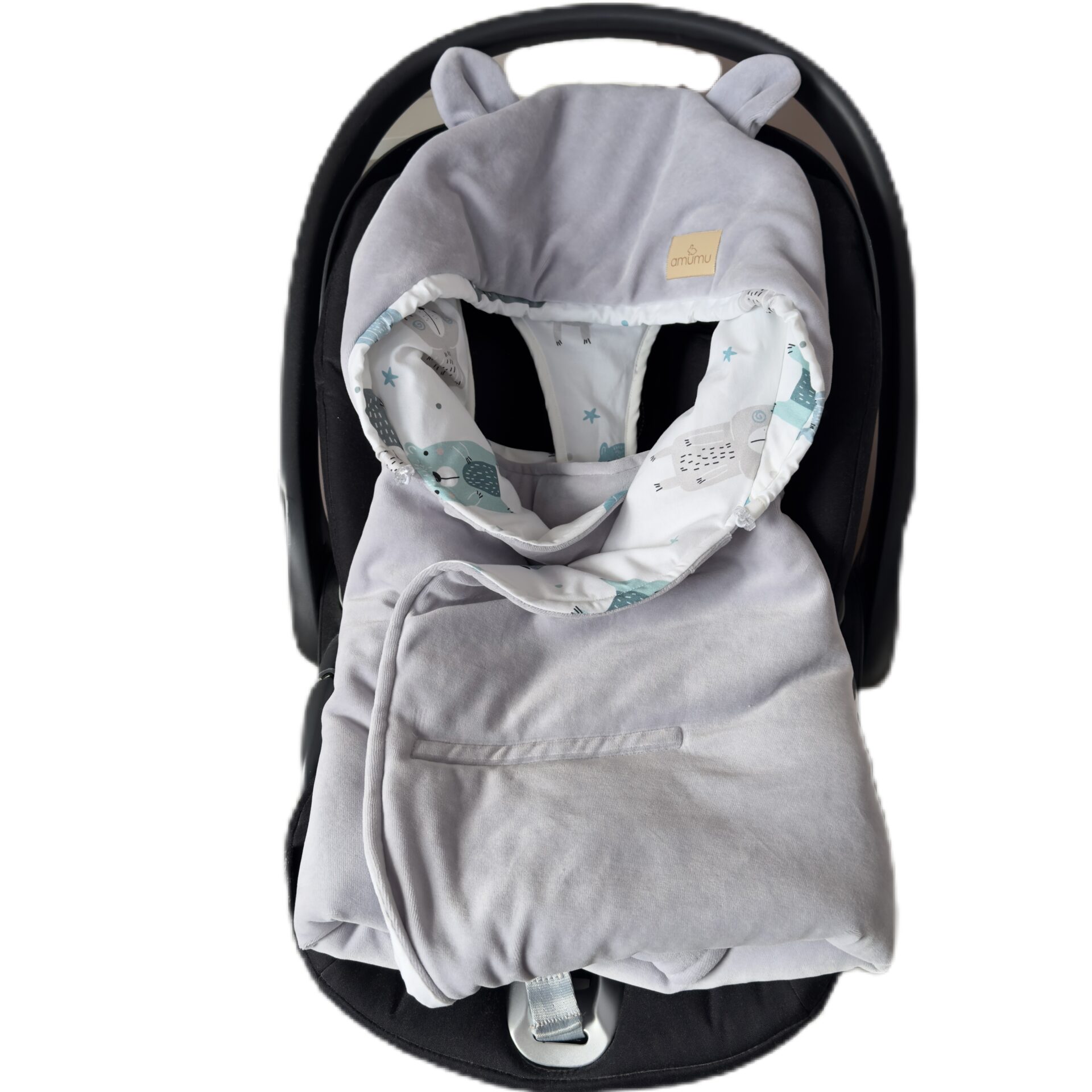 Nasz otulacz do fotelika jest ciepły i miękki, wykonany z wysokogatunkowej bawełny oraz velvetu. Posiada antyalergiczne, oddychające wypełnienie, które zapewnia maluszkowi komfort podróży. Jest delikkatny i przyjemny w dotyku, nie podrażnia skóry dziecka.